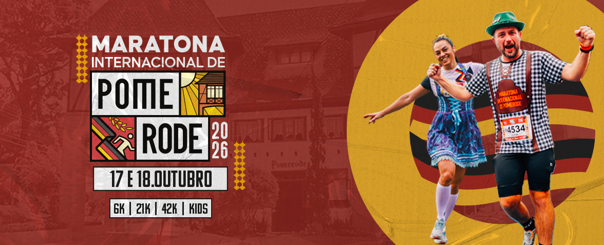 Maratona Internacional de Pomerode, a corrida mais alemã e festiva do Brasil. A prova acontece nos dias 17 e 18 de outubro de 2026, com as distâncias de 6km, 21km e 42km, além da corrida kids.